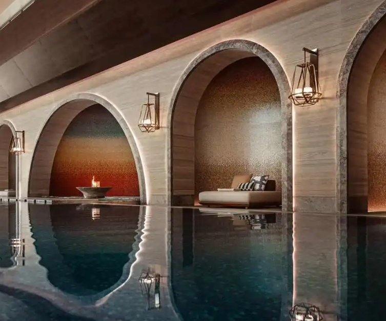 Swimming pools: Drift in serene indoor or outdoor pools, some set against mountain backdrops or immersed in tropical surroundings.